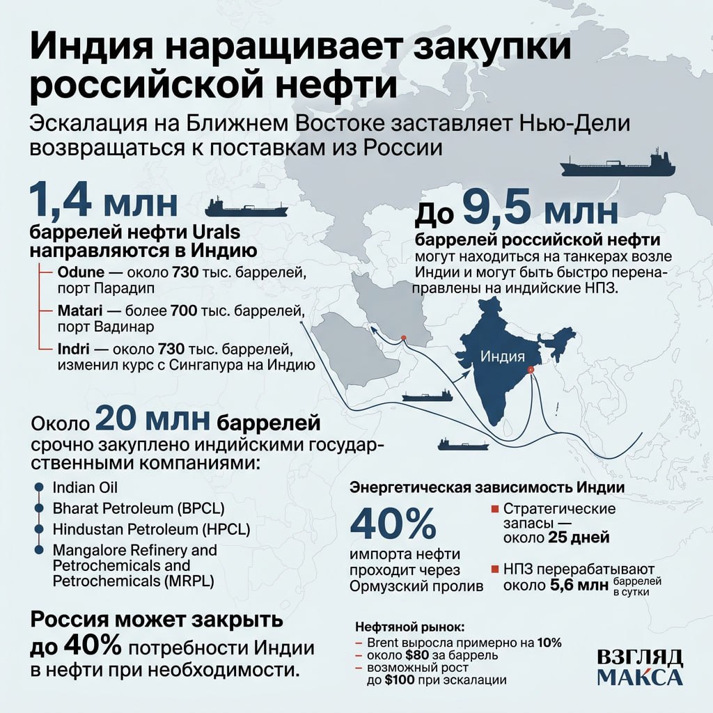 Индия начала активно наращивать закупки российской нефти на фоне обострения ситуации на Ближнем Востоке и угрозы перебоев с поставками из региона Персидского залива. Об этом сообщают сразу несколько международных изданий, включая Bloomberg, Reuters и The Economic Times.