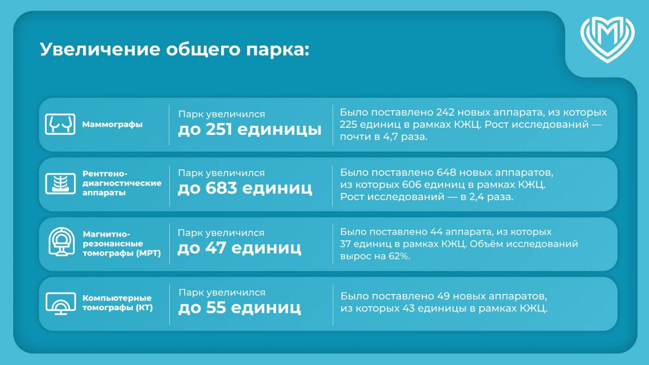 Кроме того, в больницах появились 44 аппарата МРТ — теперь их 47, а объем исследований увеличился на 62%. Поставлены и 49 аппаратов КТ, благодаря чему их общее количество достигло 55.