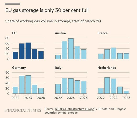Кризис пришёл в самый неподходящий момент для Европы: после суровой зимы запасы газа упали до рекордно низкого уровня в 30%. Пополнение их по текущим ценам стало бы непосильным бременем для национальных бюджетов государств-членов ЕС.
