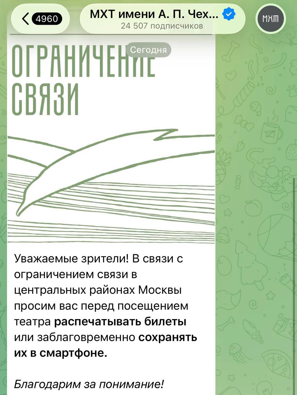 Такое сообщение появилось, например, в канале МХТ им. А.П. Чехова: