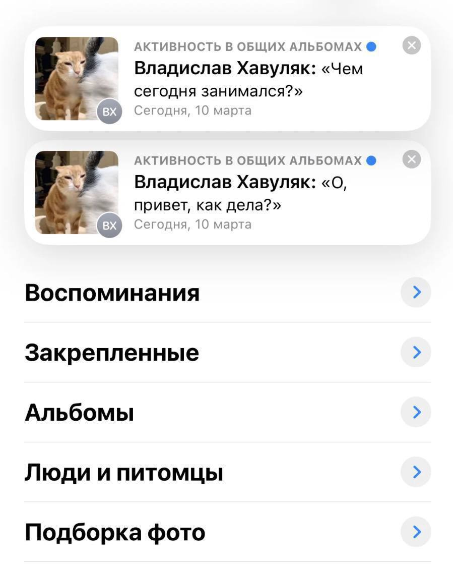 Схема простая: создаётся «Общий альбом», туда добавляют нужных людей из контактов и загружают любую фотографию. После этого можно переписываться в комментариях под снимком — уведомления приходят почти сразу.