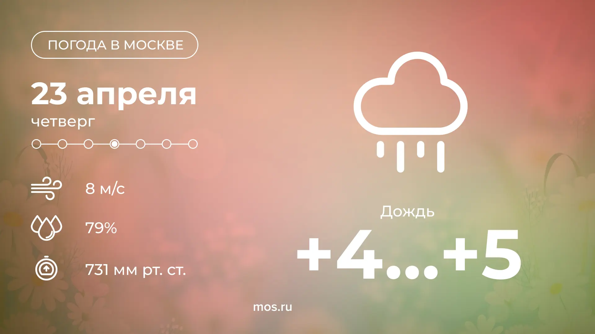 Доброе утро! Сегодня в Москве ожидается дождь. Столбики термометров покажут от +4 до +5 °С. Не забудьте взять с собой зонтик!