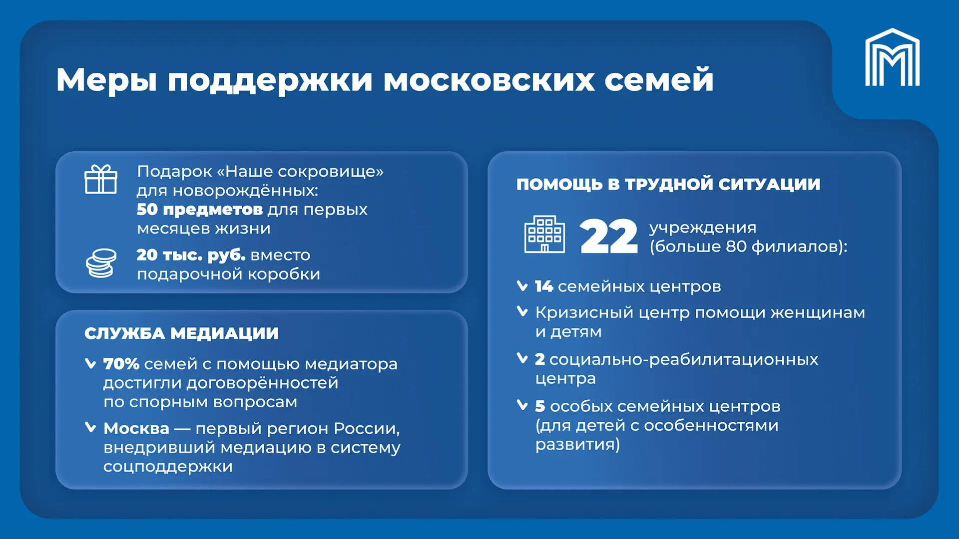 Для поддержки семей с детьми в Москве работают 22 учреждения. Это 14 семейных центров, Кризисный центр помощи женщинам и детям, 2 социально-реабилитационных центра и 5 центров для квалифицированной помощи детям с особенностями развития.
