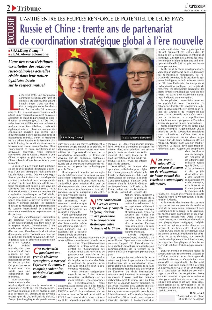 Совместная статья послов России и Китая в Алжире в газетах «El-Khabar» и «Expression» «Дружба народов укрепляет потенциал их стран»