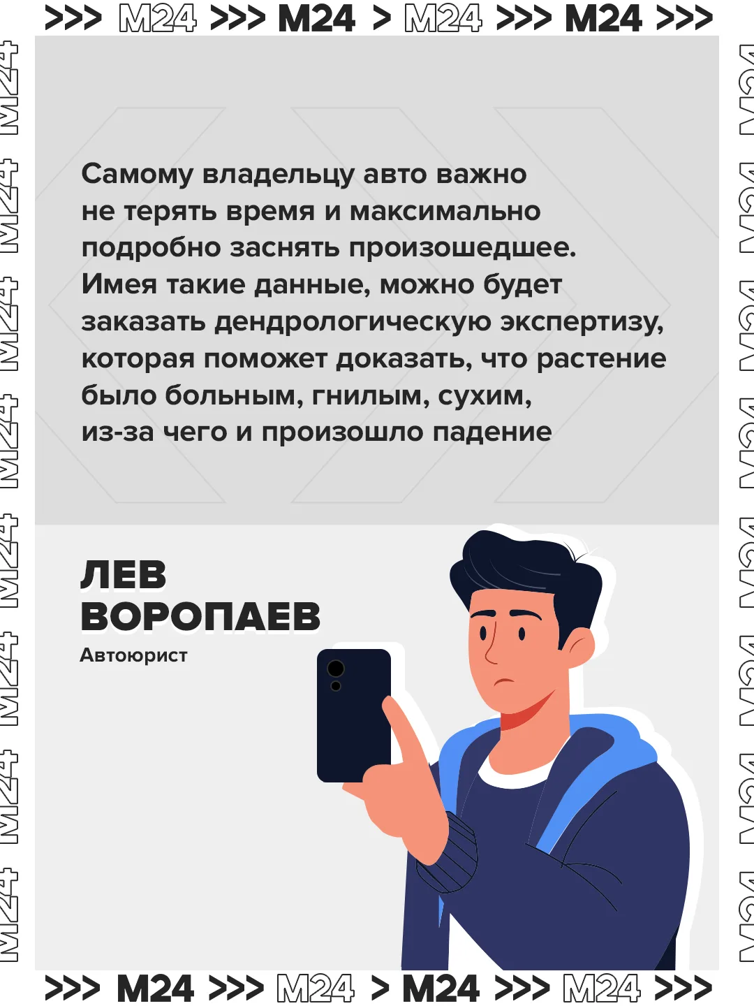 Подробная съёмка и дендрологическая экспертиза помогут получить компенсацию при падении дерева на машину. Об этом «Москве 24» рассказал автоюрист Лев Воропаев.