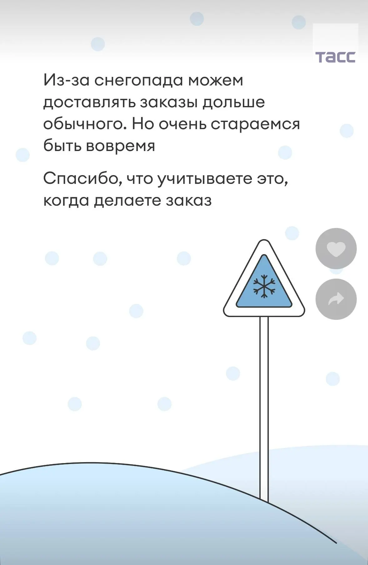 "Яндекс Лавка", "Самокат" и другие сервисы доставки предупредили пользователей о возможных задержках заказов из-за снегопада, убедился корреспондент ТАСС.
