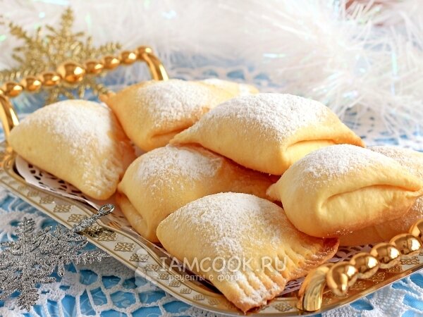 Пока тесто охлаждается, взбить белки с щепоткой соли до легкой пены. Постепенно добавлять оставшийся ванилин и сахар, продолжая взбивать до получения пиков. Охлажденное тесто поделить на 12 частей, раскатать каждую часть в тонкую лепешку. На одной стороне лепешки выкладывают ложечку взбитых белков, затем сложить лепешку пополам и еще раз пополам, защепив края.