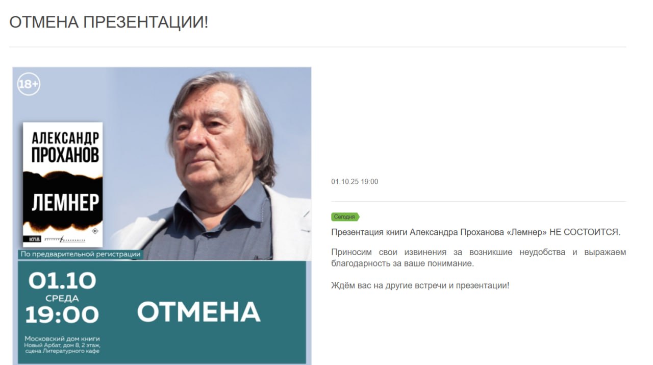 Презентация нового романа Александра Проханова «Лемнер», которая должна была сегодня состояться в МДМ – отменена. Без объяснений.