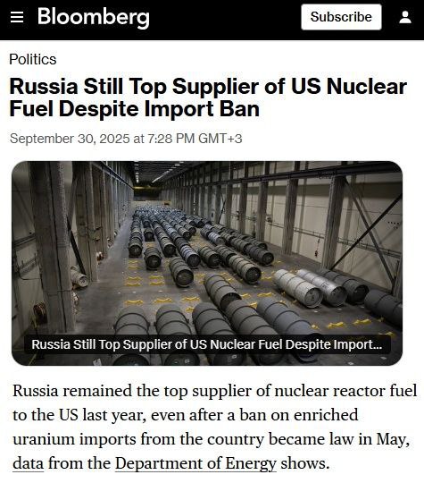 Несмотря на официальные запреты, Россия по-прежнему остаётся крупнейшим поставщиком ядерного топлива для США. Закон о запрете ввоза обогащённого урана из России был принят в мае 2024 года и вступил в силу в августе. Но, как выяснилось, «запрет» оказался чисто декоративным.