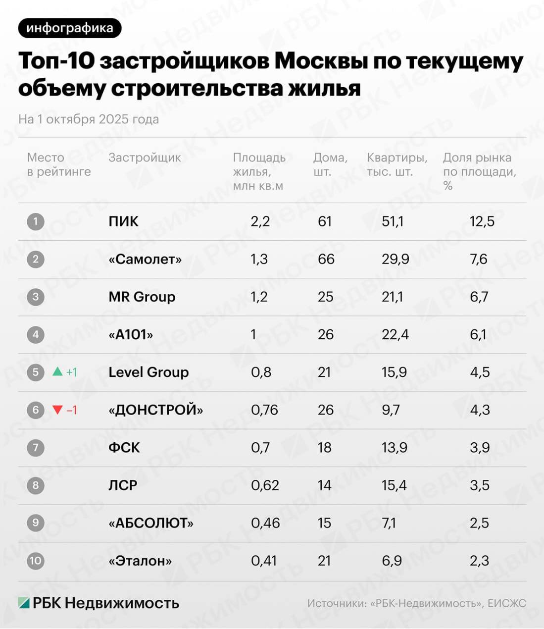 ТОП-10 крупнейших застройщиков по объемам строительства в России и Москве на начало октября 2025 года
