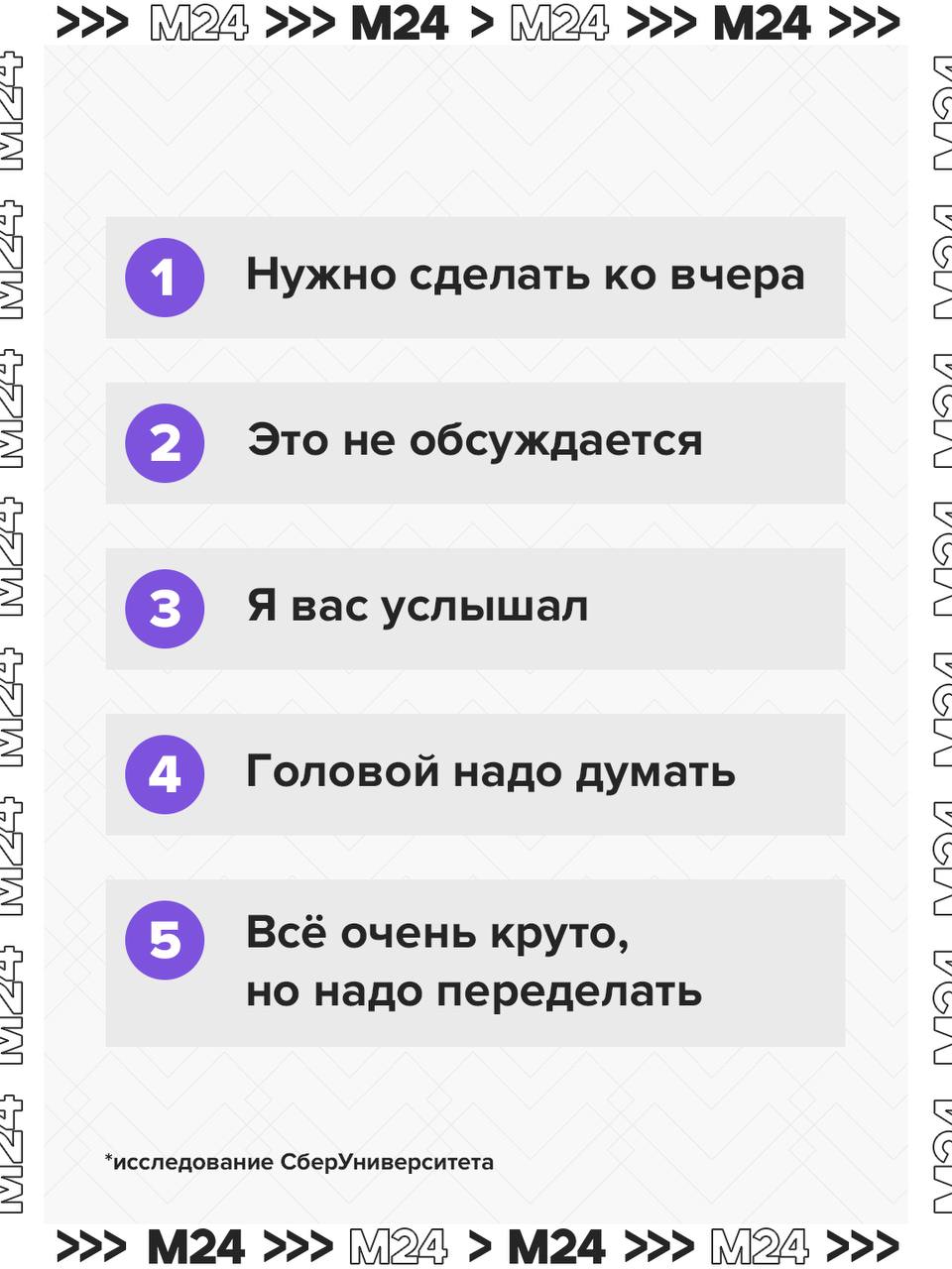 Мы собрали топ-5 таких выражений, а от вас хотим услышать самые странные, смешные или даже пугающие фразы от начальства. Можете присылать их в @infomoscow24bot — соберём самые-самые в отдельный пост.