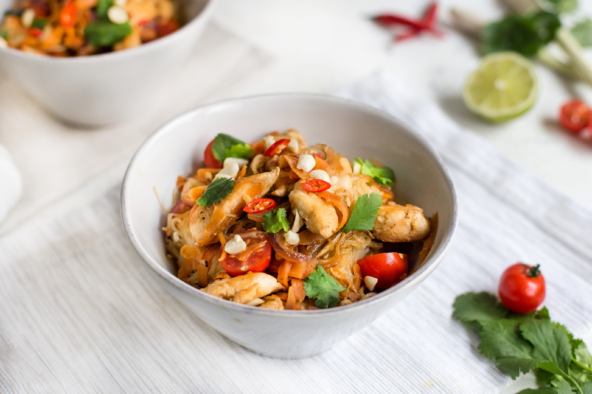 На следующем этапе разогреть сковороду с растительным маслом и обжарить куриное филе в течение 2-3 минут. Затем добавить лук, чеснок, морковь, лемонграсс и перец чили, готовить на среднем огне еще 4-5 минут. Далее добавить арахисовую пасту, сок половины лайма, соевый и рыбный соус, тщательно перемешать и продолжить готовить еще около 3-4 минут.