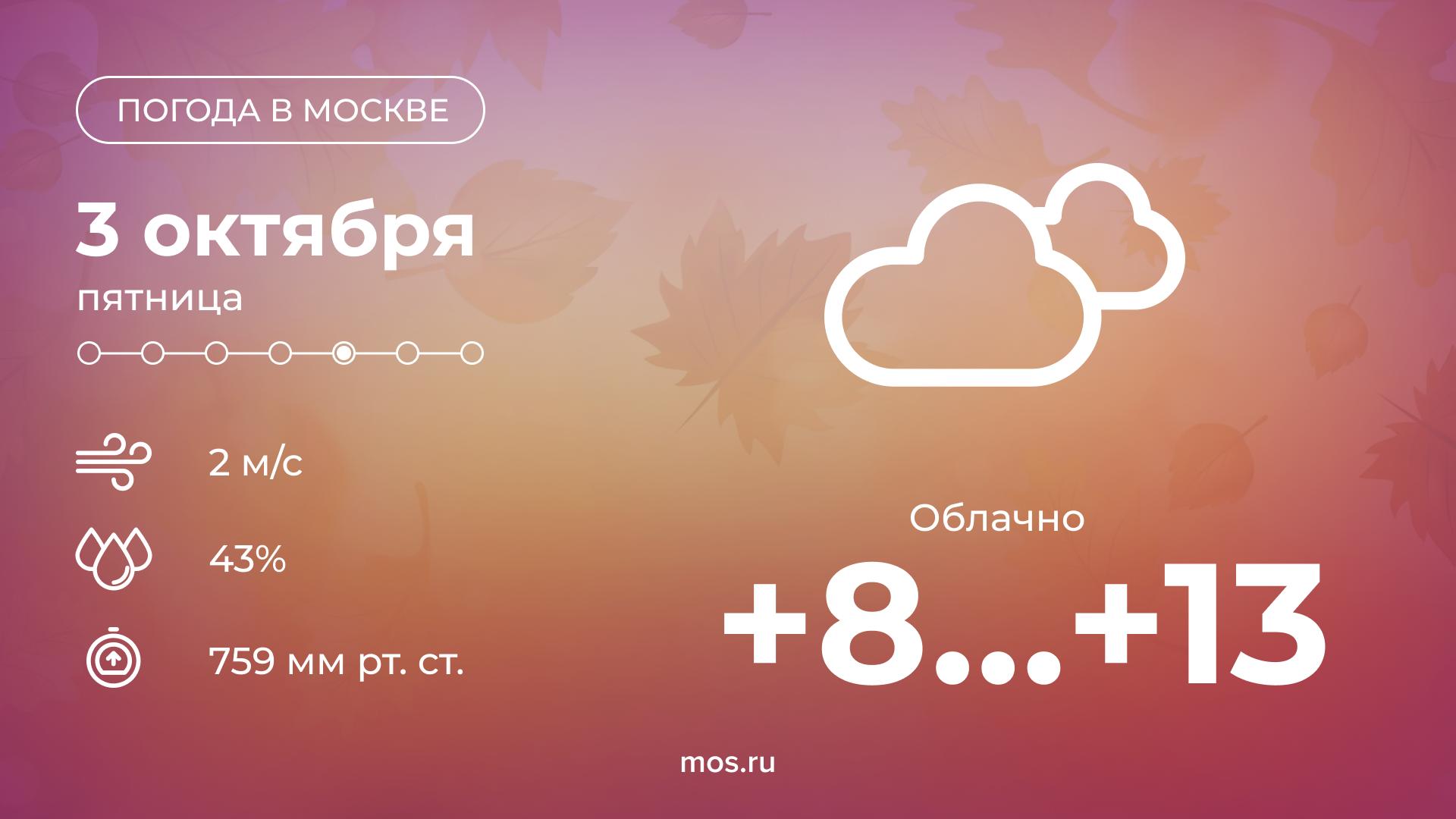 Доброе утро!Сегодня в Москве будет облачно. Температура воздуха днем поднимется до +13 °С.