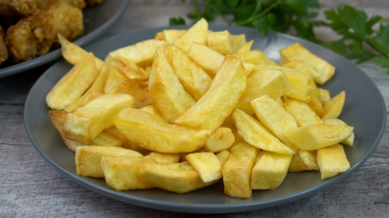 1. Начинать стоит с подготовки картофеля: очистить клубни и нарезать их на симметричные бруски, чтобы они равномерно обжаривались.