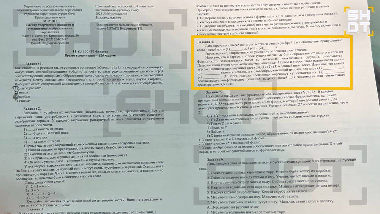 Загадку с упоминанием текста рэпера-иноагента заметили 11-классники на олимпиаде по русскому языку в Сочи. Они обратили внимание, что в одном из заданий использовалась строчка трека Оксимирона* «Я хейтер»: «Твой рэп — подтасовка, мой рэп — потасовка». В тексте музыканта называют «известным рэпером», не уточняя, что в России он признан иноагентом, но и не упоминая его имени, отмечает канал Shot. В сети это задание вызвало бурное обсуждение.