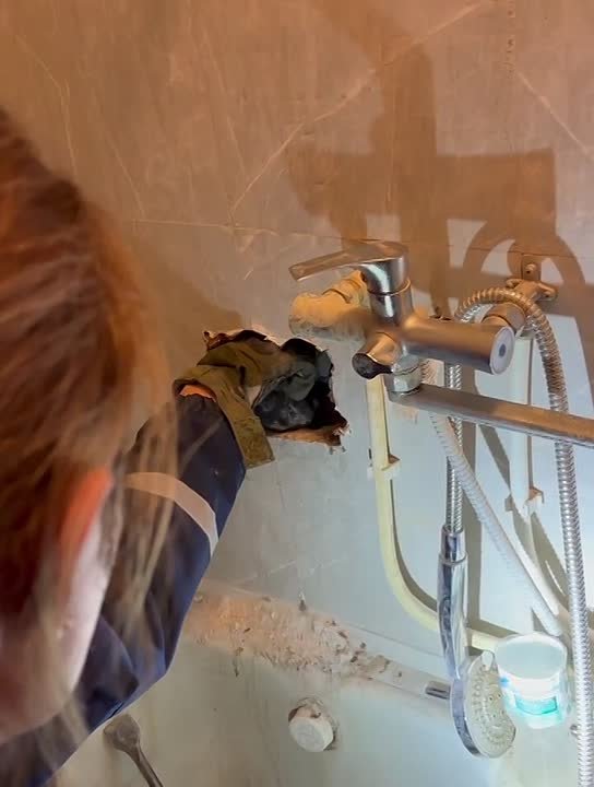 Добровольцы отряда "СпасРезерв" приступили к строительным работам: проделали три отверстия в стене и после многочасовой операции наконец освободили кошку.