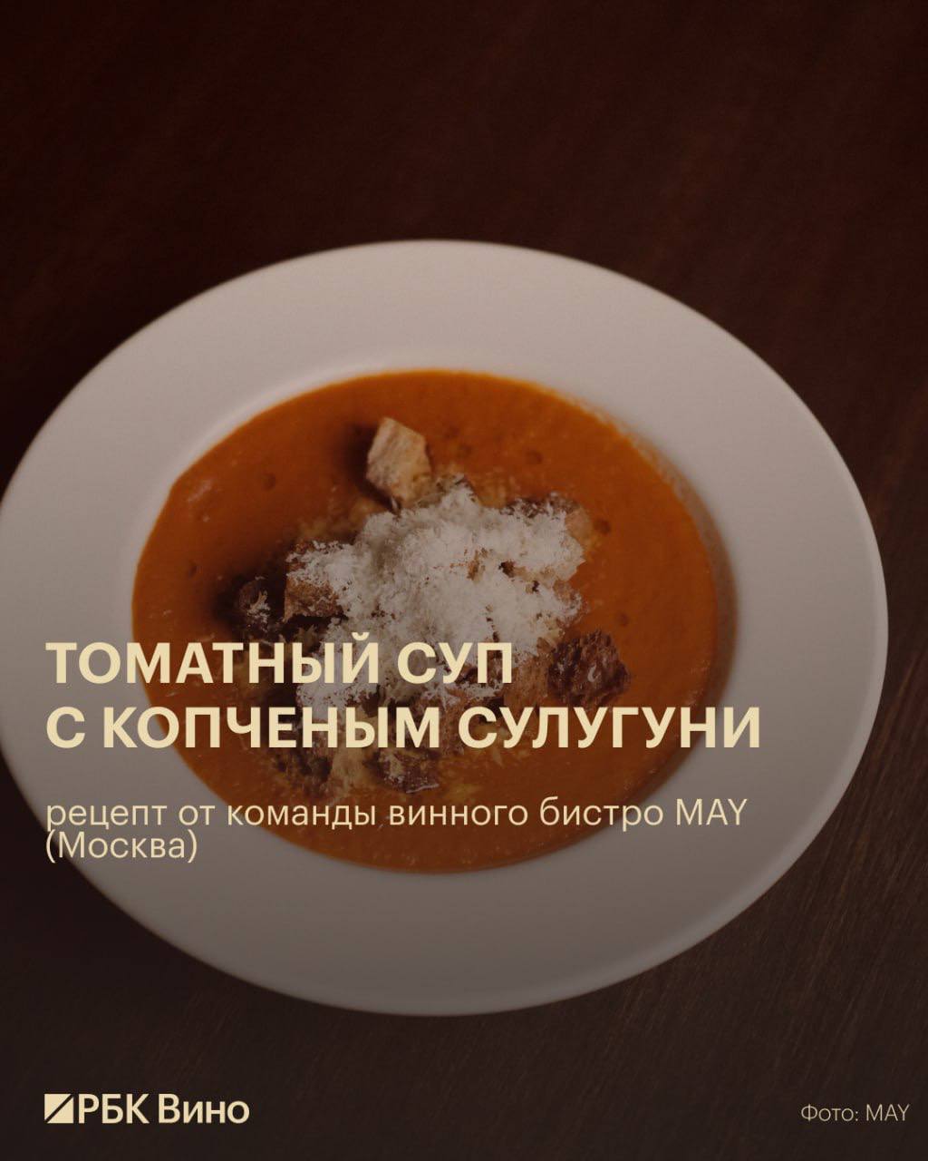 Один из рецептов — томатный суп с копченым сулугуни от команды винного бистро MAY (Москва).