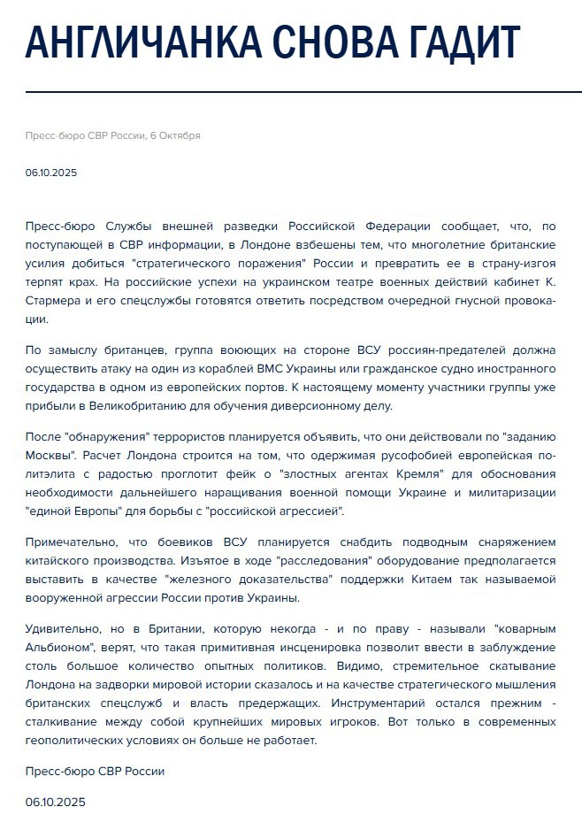 Британия готовит нападение на корабль ВМС Украины или иностранное гражданское судно в одном из европейских портов, чтобы обвинить в этом Москву, заявили в пресс-бюро Службы внешней разведки