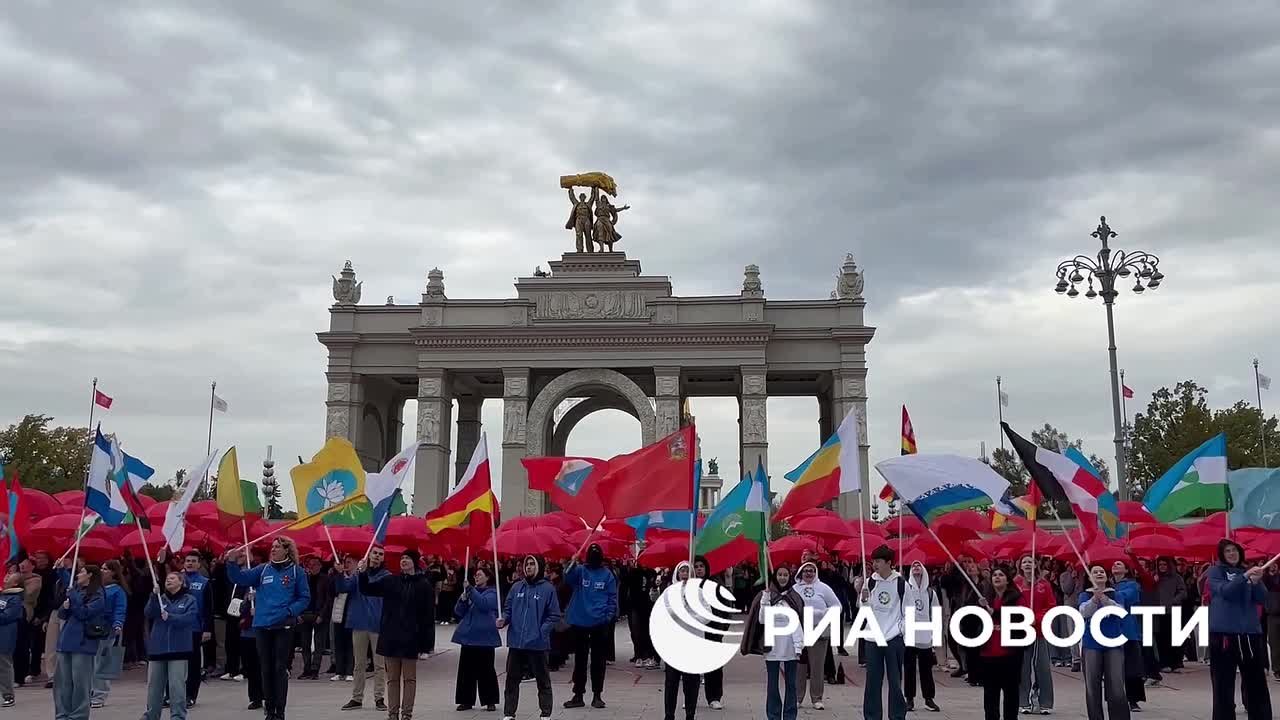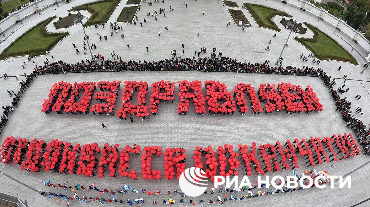 Более 4 тысяч активистов "Молодой Гвардии Единой России" провели флешмоб в Москве ко дню рождения Путина - они выстроились во фразу "Поздравляем от Донбасса до Камчатки", передает корреспондент РИА Новости