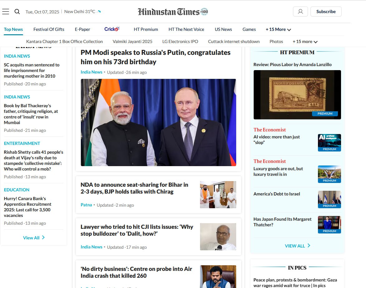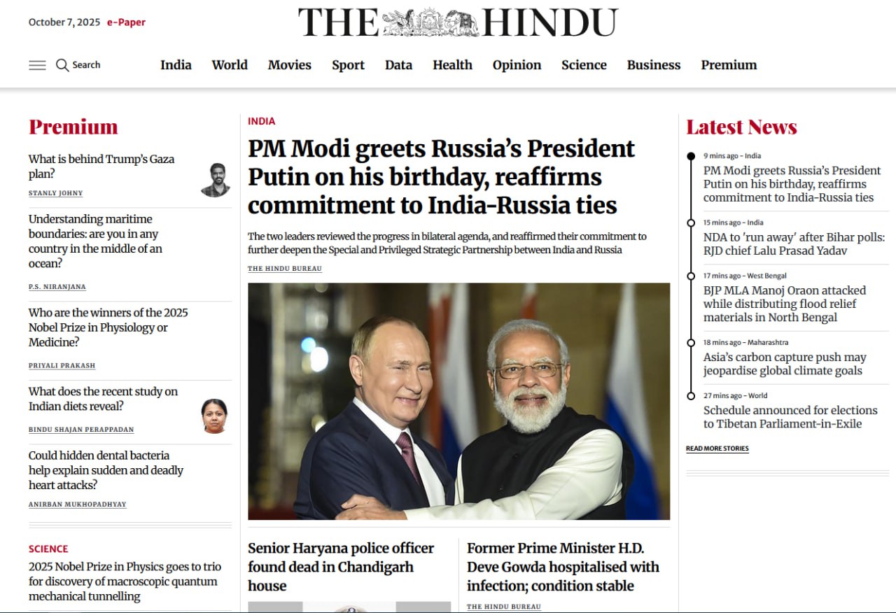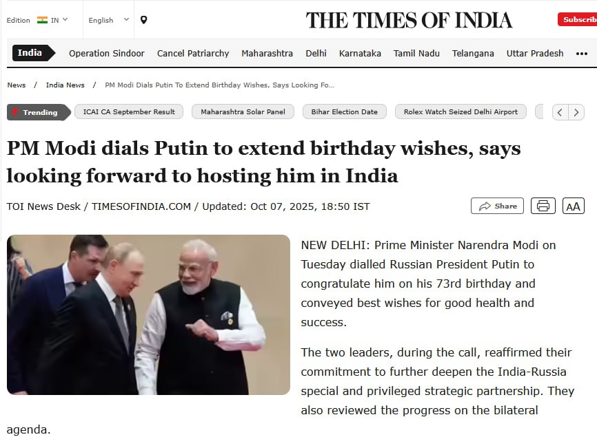 Моди поздравил Путина с днем рождения. Эта новость попала на первые полосы индийских СМИ