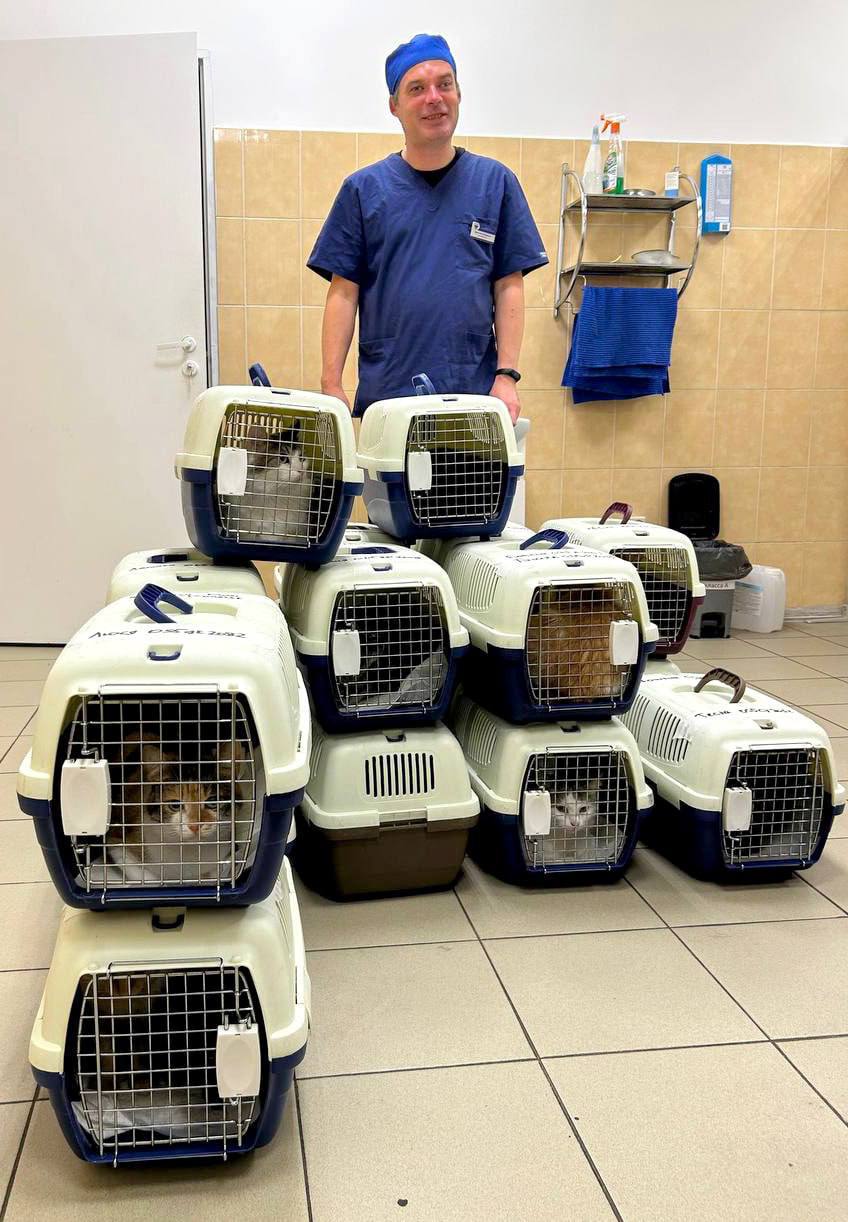 Московский ветеринар Алексей Михайлович Щукин на смене точно не скучал — на приём к нему пришли сразу 22 пушистые пациентки из приюта «Кошкин Дом Донецк».