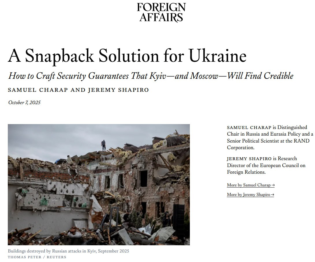 В экспертных кругах США и Европы набирает силу дискуссия о послевоенных гарантиях безопасности для Украины. В статье для Foreign Affairs бывшие советники Госдепа Джереми Шапиро и Сэмуэл Чарап признали: обещания о вводе войск или применении статьи 5 Устава НАТО — не более чем иллюзии.