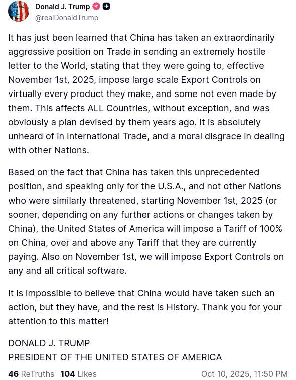 «Только что стало известно, что Китай направил крайне враждебное письмо всему миру, в котором заявил, что с 1 ноября 2025 года вводит масштабный экспортный контроль практически на все производимые им товары, а также на некоторые, которые они даже не производят. Это затрагивает ВСЕ страны без исключения и, очевидно, было планом, разработанным ими много лет назад. Это абсолютно беспрецедентно в международной торговле и является моральным позором в отношениях с другими нациями».