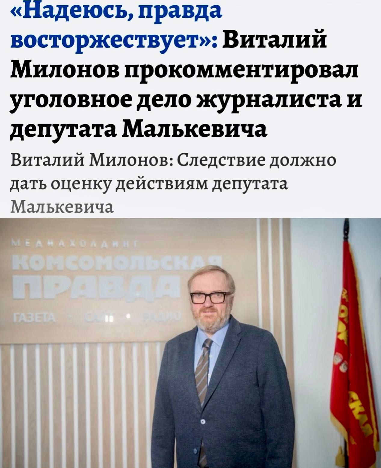 Депутат Госдумы Виталий Милонов пожелал сил своему знакомому, журналисту Александру Малькевичу, который оказался фигурантом уголовного дела о хищении 37 миллионов рублей из бюджета телеканала «Санкт-Петербург».