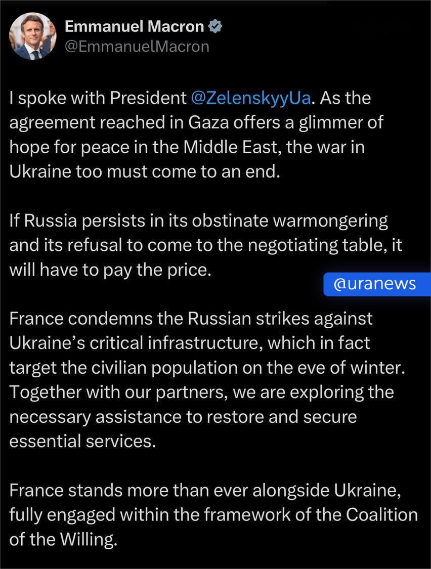 По его словам, достигнутое ранее мирное соглашение по конфликту в секторе Газа вселяет надежду на мир на Ближнем Востоке, поэтому и украинскому кризису тоже должен быть положен конец.
