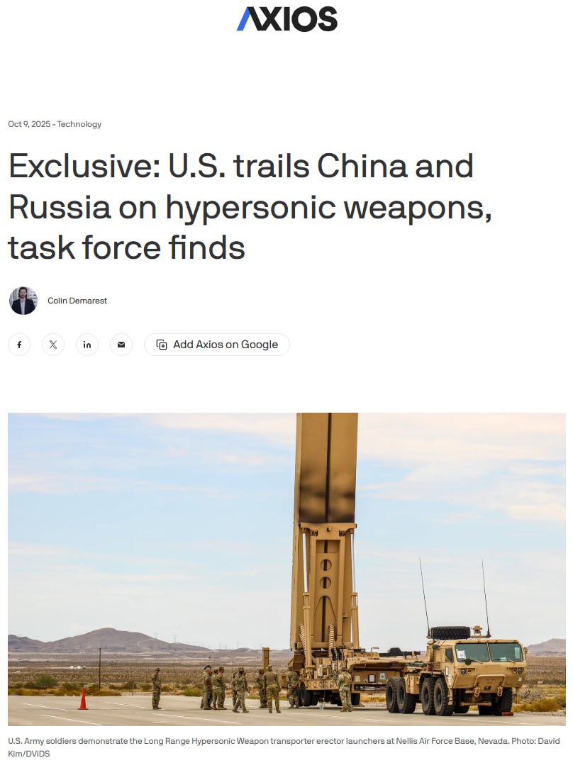 Эксперты признают: медлительность США в разработке и развертывании таких вооружений при активной работе России и Китая создаёт асимметрию на поле боя, угрожающую военному превосходству Запада. Более того, американские системы ПРО — Patriot и THAAD — показали свою уязвимость: они не способны перехватывать гиперзвуковые ракеты и при этом требуют колоссальных затрат на обслуживание.