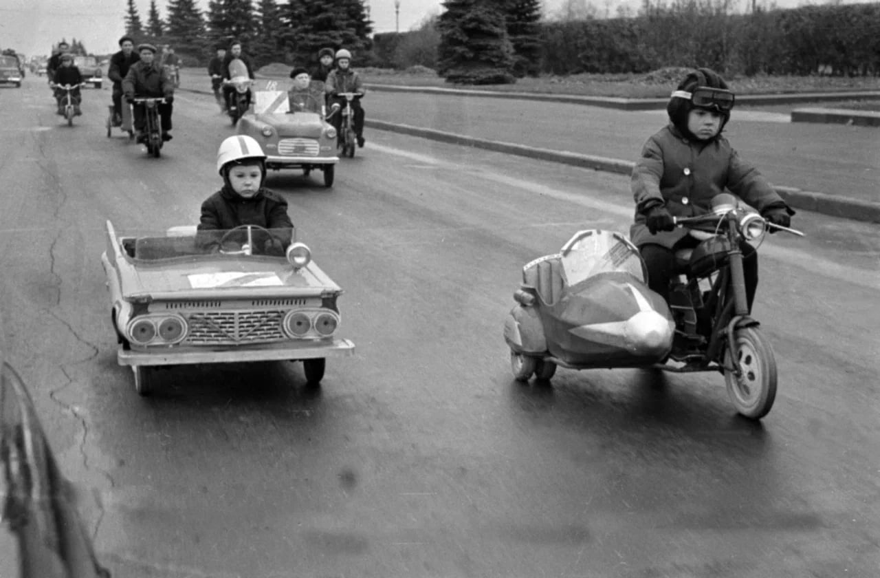 Фотофакт: Юные водители, получившие призы за мастерство вождения автомобиля и мотоцикла, на параде-конкурсе любительских авто- и мотоконструкций на приз журнала «Техника молодёжи». Автор В. Хухлаев. Москва, 23 октября 1966 г. Главархив Москвы