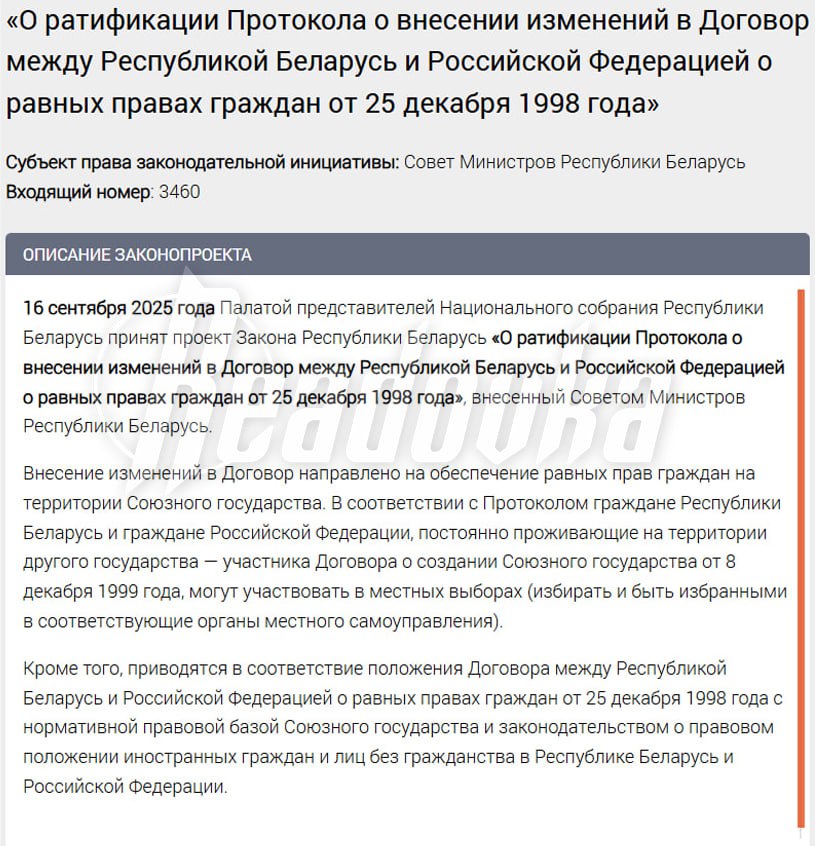 До подписания протокола 13 марта этого года в Москве за 2024 в местные советы депутатов избрались 15 жителей РФ, заявил первый замминистра иностранных дел Белоруссии Сергей Лукашевич. Чиновники ратифицировали и соглашение о взаимной защите граждан от необоснованного преследования международными органами юстиции. Принятые поправки направлены на действующих или бывших должностных лиц.