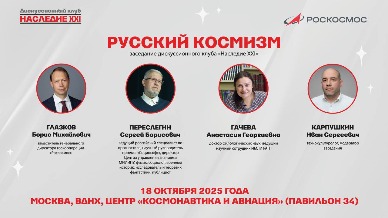 18 октября в Центре «Космонавтика и авиация» на ВДНХ при поддержке Роскосмоса пройдет II заседание Клуба «Наследие XXI».