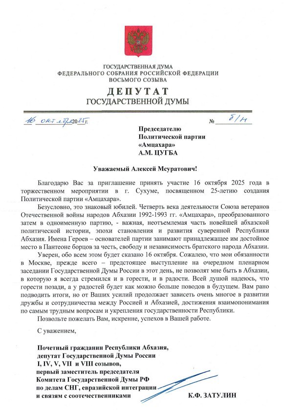 Благодарю Вас за приглашение принять участие 16 октября 2025 года в торжественном мероприятии в г. Сухуме, посвященном 25-летию создания Политической партии «Амцахара».