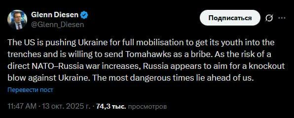 "США подталкивают Украину к полной мобилизации, чтобы привлечь молодежь к боевым действиям, и готовы послать Tomahawk в качестве взятки. По мере роста риска прямой войны между НАТО и Россией, Москве, похоже, придется нанести Украине сокрушительный удар. Грядут опасные времена", — заявил норвежский профессор Гленн Дизен.