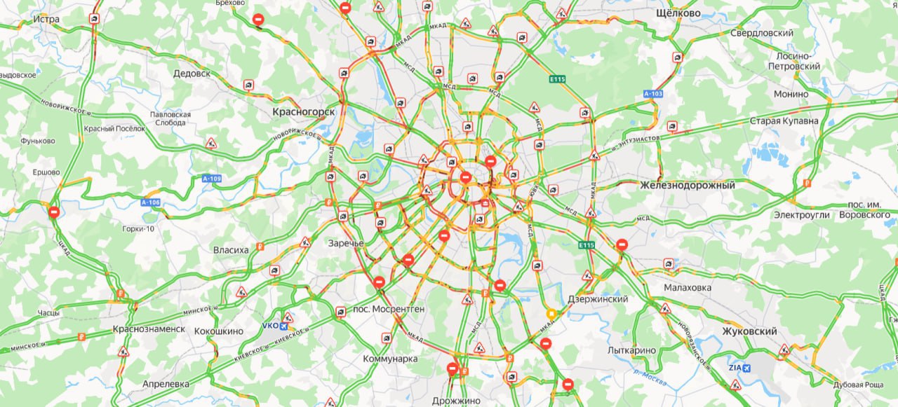 Дорожное движение в столице парализовали 8-балльные пробки, согласно данным Яндекса. Машины едут со средней скоростью 27-30 км/ч.