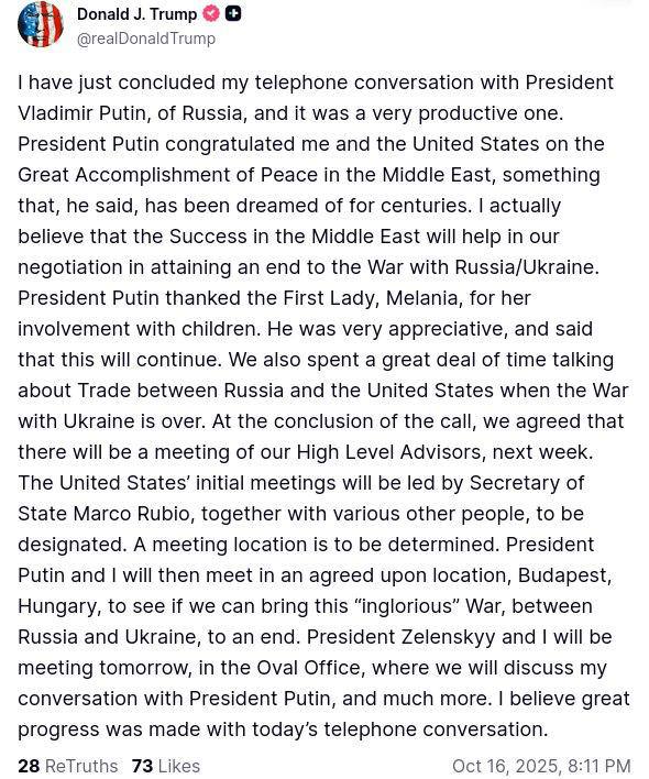 На следующей неделе состоится встреча высокопоставленных советников России и США под руководством госсекретаря Марко Рубио, написал американский президент в своей соцсети после звонка.