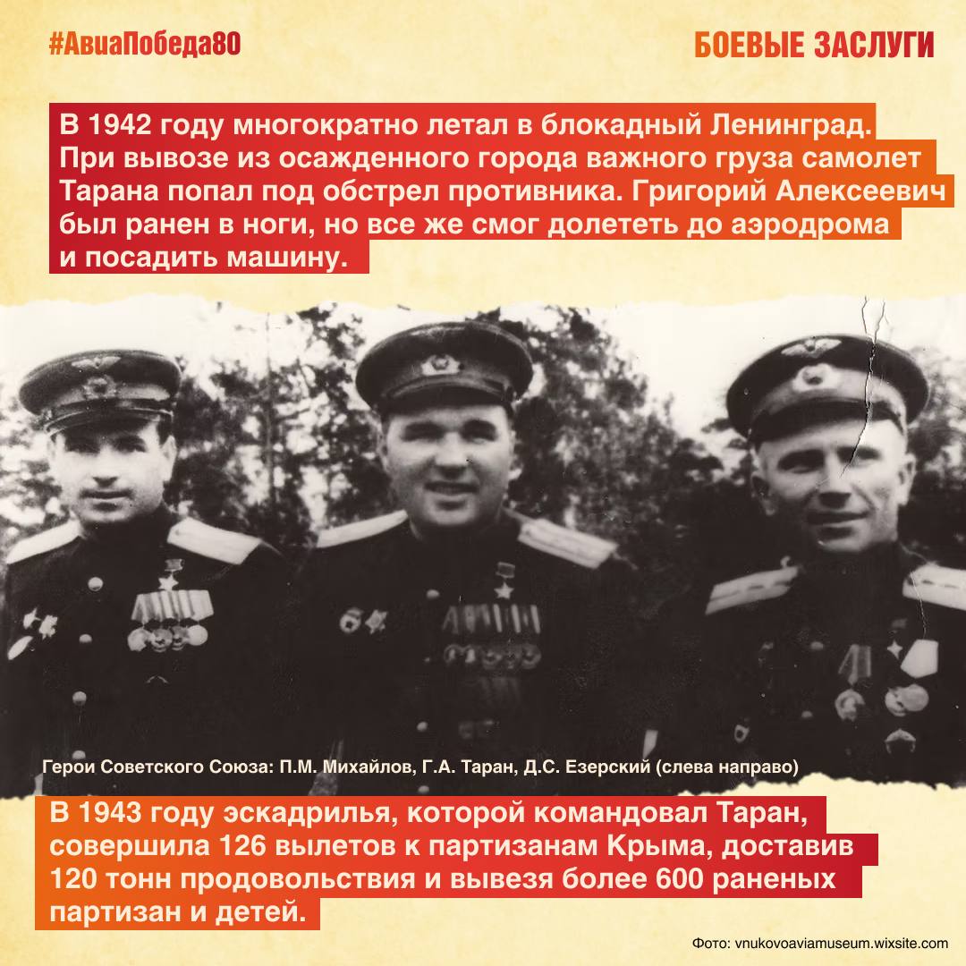 С июля 1941 года Григорий Таран воевал на фронте. К концу сентября 1944 года совершил 660 боевых вылетов в тыл противника и на передний край, в том числе 225 вылетов – в должности командира полка.