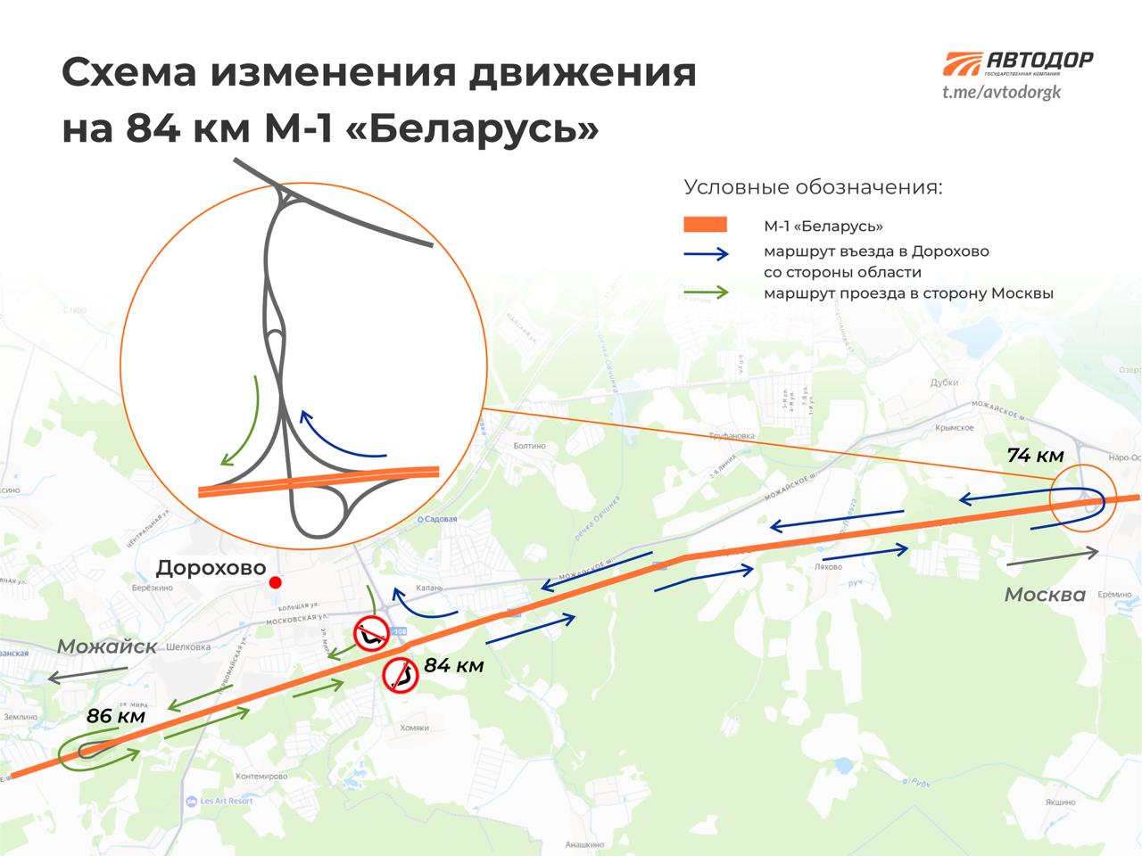 Для выезда с М-1 «Беларусь» со стороны области для заезда на А-108 необходимо проехать до транспортной развязки на 74 км и выполнить разворот.