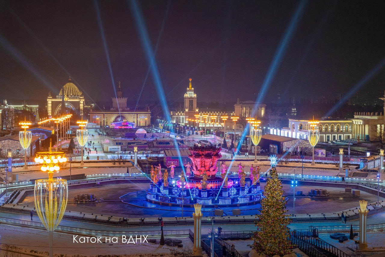 На самом большом катке Москвы на ВДНХ можно будет прокатиться на коньках вдоль Главной аллеи и вокруг фонтанов "Дружба народов" и "Каменный цветок", а также принять участие в событийной программе.
