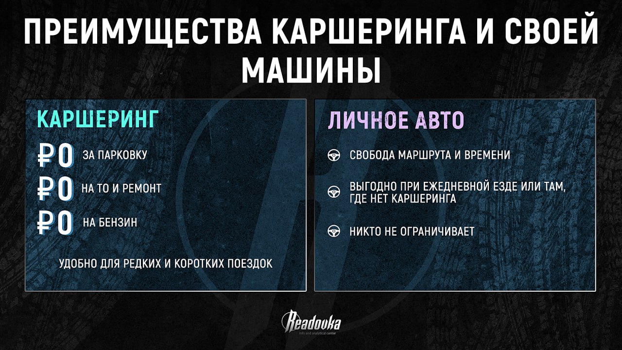 Кроме того, у каршеринга есть ряд неучтенных преимуществ — бесплатная парковка, отсутствие затрат на ТО и ремонт, а также удобство при коротких или редких поездках. Но полная свобода действий и независимость остаются только у владельцев собственных машин.