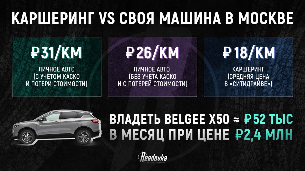Передвигаться по столице на каршеринге оказалось в 1,7 раза дешевле, чем владеть собственным автомобилем. Самым популярным арендным авто за сентябрь стал BelGee X50 — километр на нем в среднем обходится в 18, сообщили Readovka в «Ситидрайв».