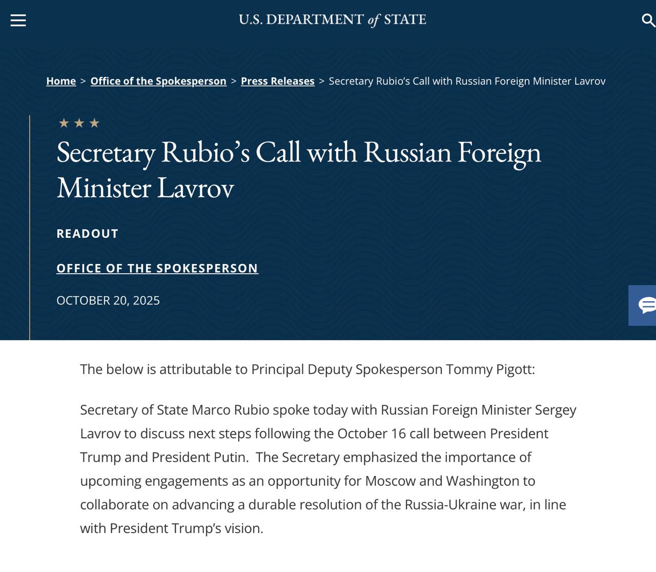 «Госсекретарь Марко Рубио сегодня провёл разговор с министром иностранных дел России Сергеем Лавровым, обсудив дальнейшие шаги после телефонного разговора 16 октября между президентами Трампом и Путиным.