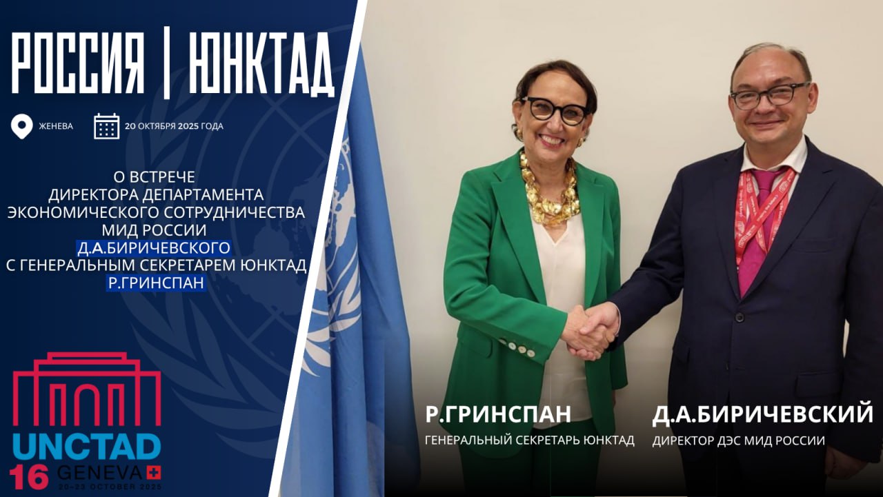 20 октября «на полях» 16-й Министерской Конференции ООН по торговле и развитию #ЮНКТАДXVI состоялась встреча директора Департамента экономического сотрудничества Д.A.Биричевского с Генеральным секретарем ЮНКТАД Р.Гринспан.