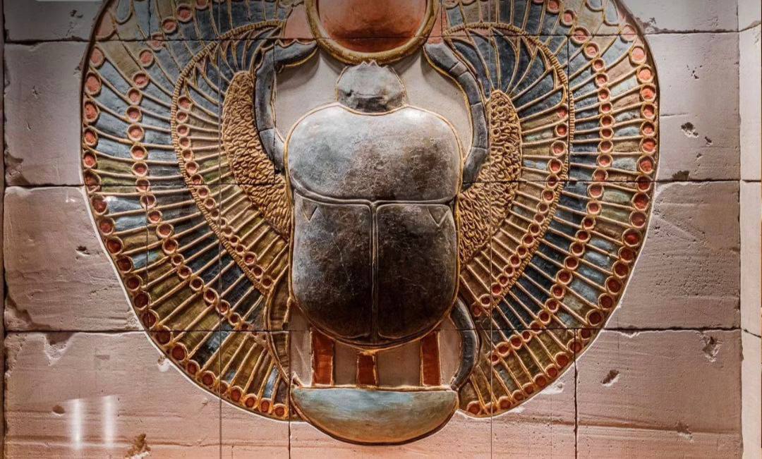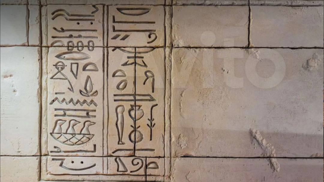 На стенах египетские иероглифы и фигурка жука-скарабея.