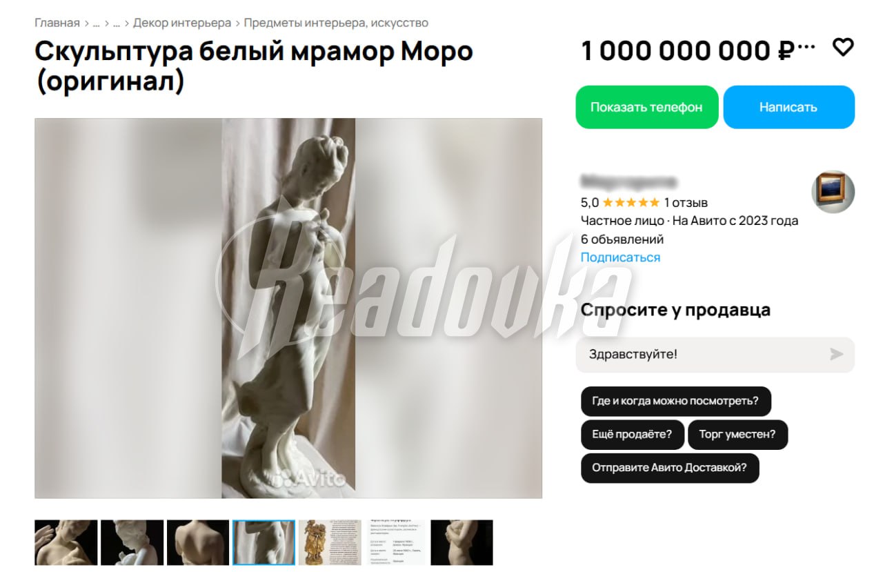 На одном из сайтов с объявлениями появился чересчур дорогостоящий лот в виде мраморной статуэтки за 1 млрд. В анкете говорится о подлиннике французского скульптора Ипполита Моро — «Девушка с голубем» 1880 года. Именно эта фигурка считается самой популярной на аукционах, в антикварных лавках и сувенирных магазинах, но как репродукция.