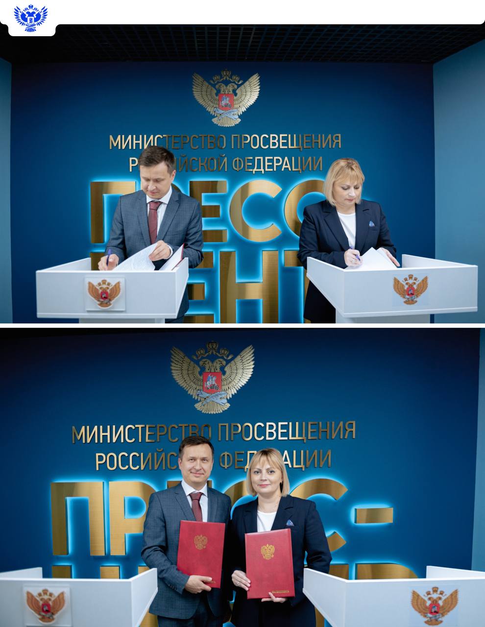 В Москве прошла церемония подписания соглашения о взаимодействии между Министерством просвещения РФ и Профессиональным союзом работников народного образования и науки РФ. Свои подписи поставили замминистра просвещения РФ Ольга Колударова и зампредседателя Общероссийского Профсоюза образования Виктор Шабельник.
