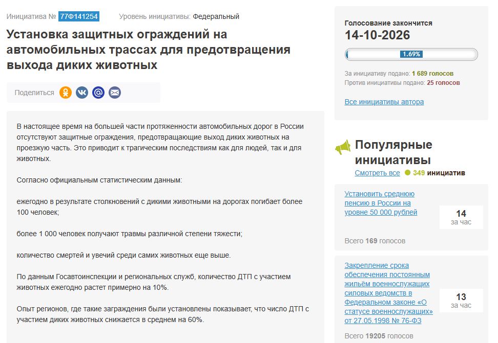 «Вдоль Москвы установлено достаточно много сеток, и у них высокая эффективность. Разные специалисты, в том числе те, которые охраняют животных, дают добро на установку таких сеток при условии, что создаются ещё мосты, переходы для миграции и так далее. Это спасает людей и животных, точно снижает аварийность. У меня нет статистики, я не эксперт, но я знаю, как в Москве они устанавливаются. Я хочу дойти до власть имеющих и постараться ещё продвинуть инициативу».