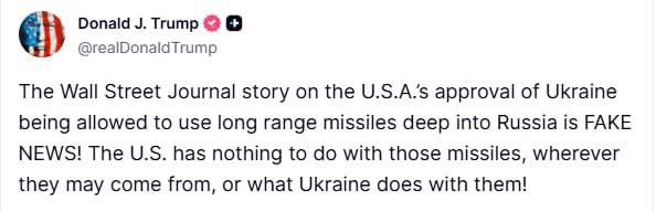 «История в Wall Street Journal о том, что США одобрили Украине использование дальнобойных ракет вглубь на территории России, — ФЕЙК НЬЮС!».