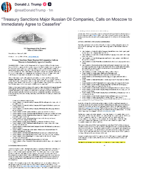 «Минфин вводит санкции против крупных российских нефтяных компаний, призывает Москву немедленно согласиться на прекращение огня»
